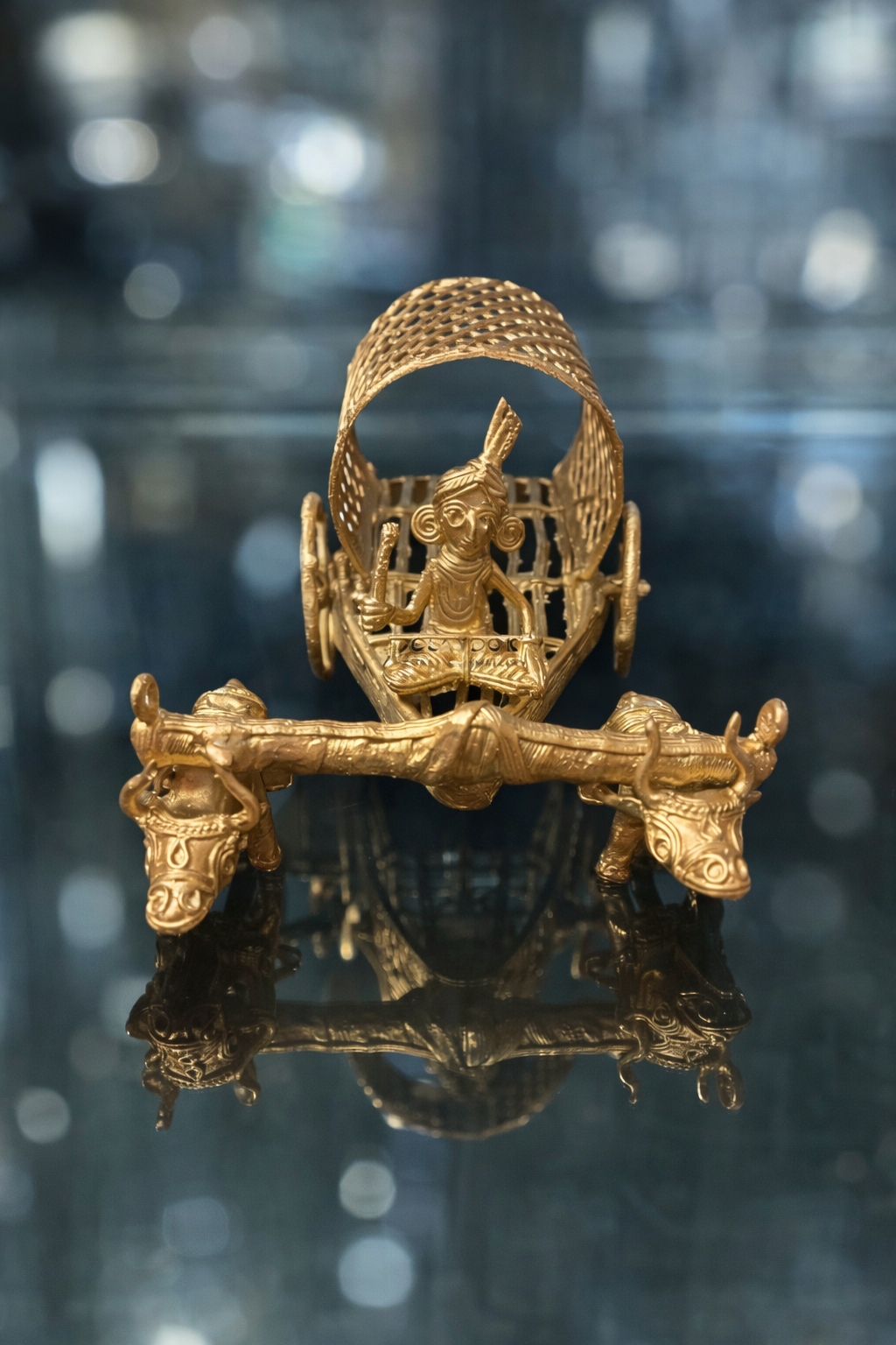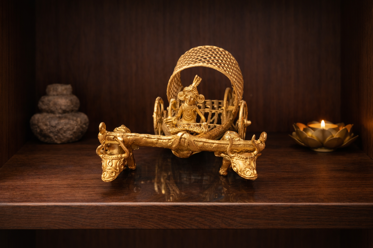 This exquisite Dokra bullock cart sculpture is a masterful expression of India’s ancient lost-wax metal casting tradition, practiced for over 4,000 years by tribal artisans. Cast entirely by hand, the piece features a finely detailed tribal figure seated in a woven canopy cart, drawn by two stylised bullocks—symbolising journey, prosperity, and rural harmony.