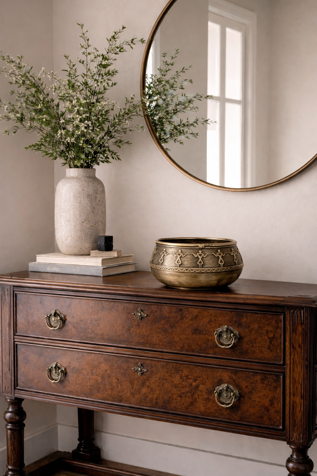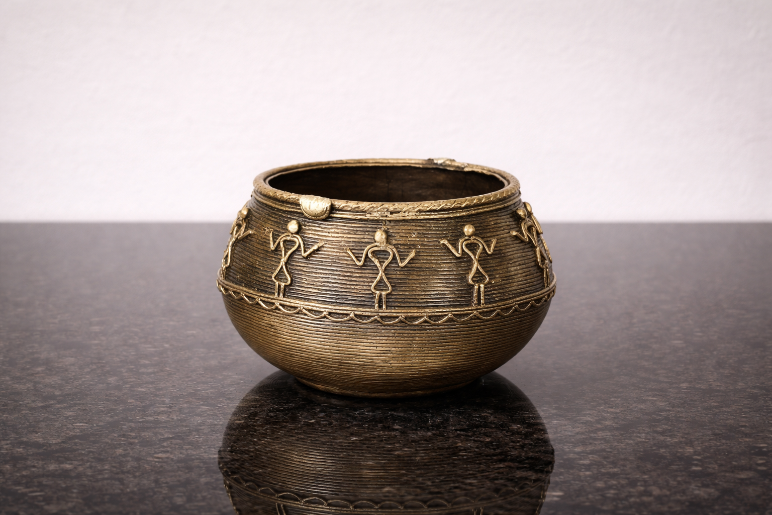 The Mana Bowl is a stunning example of India’s tribal artistry, crafted using the age-old Dhokra (lost-wax) technique. Featuring rhythmic tribal dancers in relief, this round brass bowl brings together form, function, and folklore. The name “Mana” draws from traditional Indian vessels used in rituals and offerings, symbolizing abundance and sacredness.