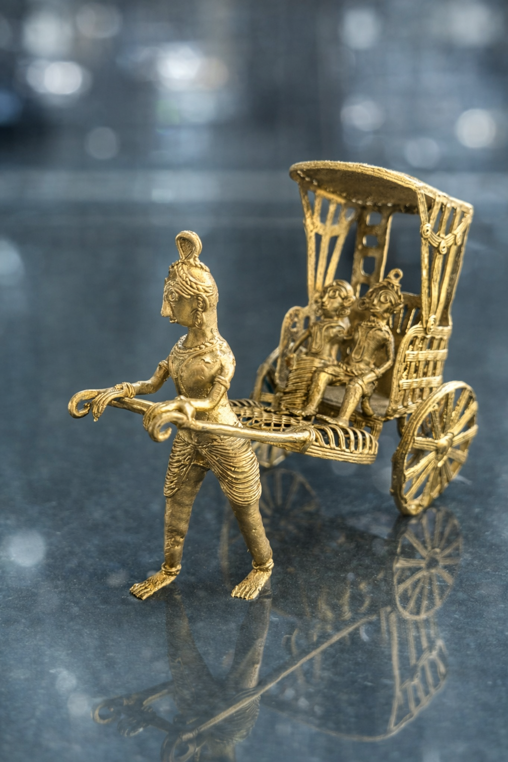 A striking handcrafted brass sculpture depicting a traditional rickshaw scene, meticulously created using the age-old Dokra (lost-wax) technique. This evocative piece captures movement, resilience, and daily life—transforming a humble moment into a collectible work of art.