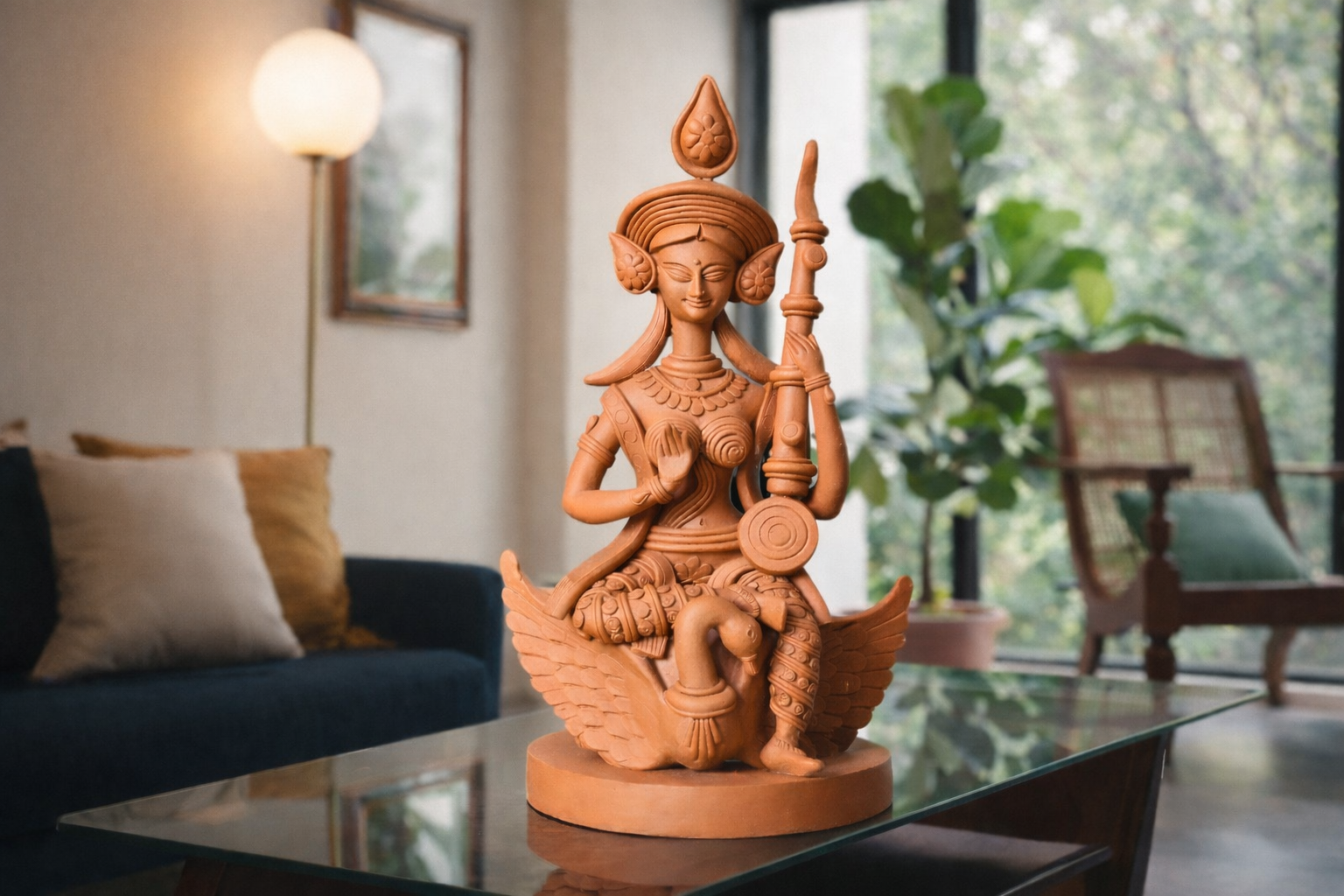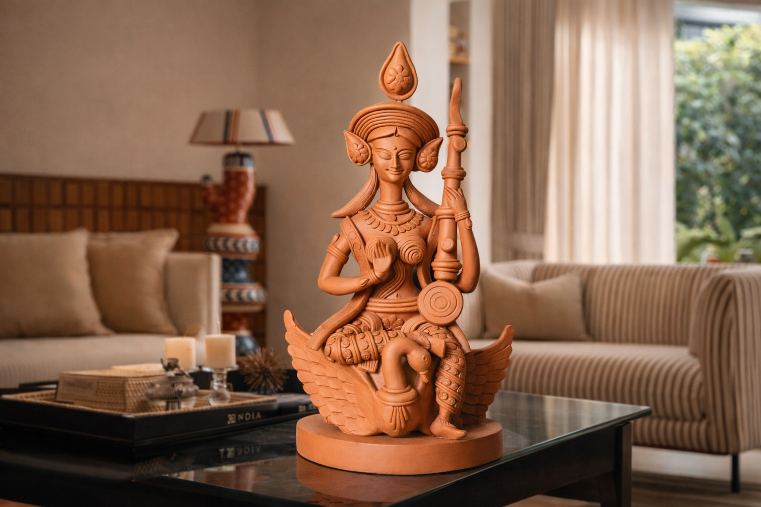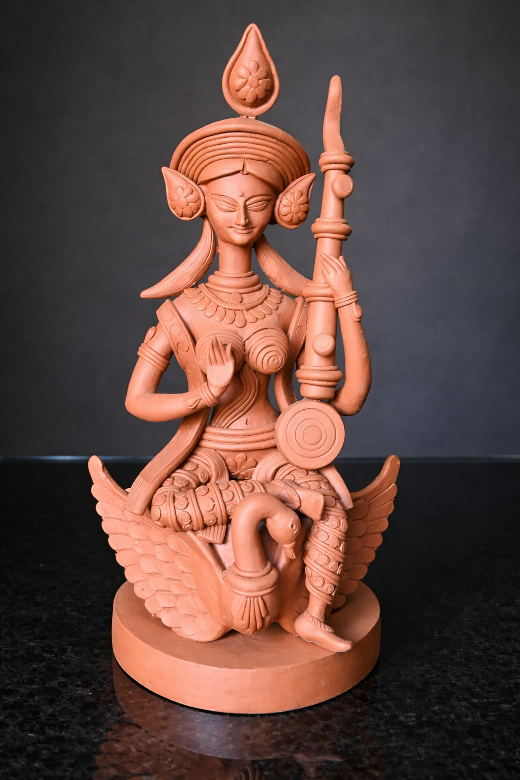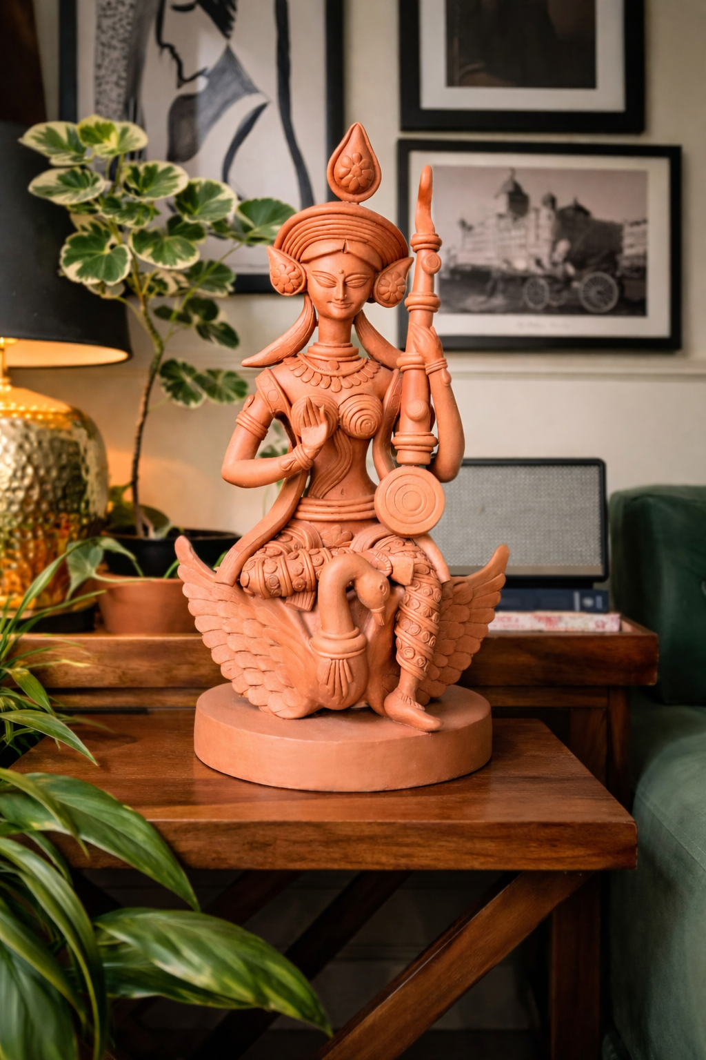- Bring home the timeless grace of knowledge and creativity with this exquisitely handcrafted terracotta Saraswati idol. Seated serenely on her divine swan, Goddess Saraswati symbolizes wisdom, art, and purity — making this piece both spiritually uplifting and aesthetically refined.ence