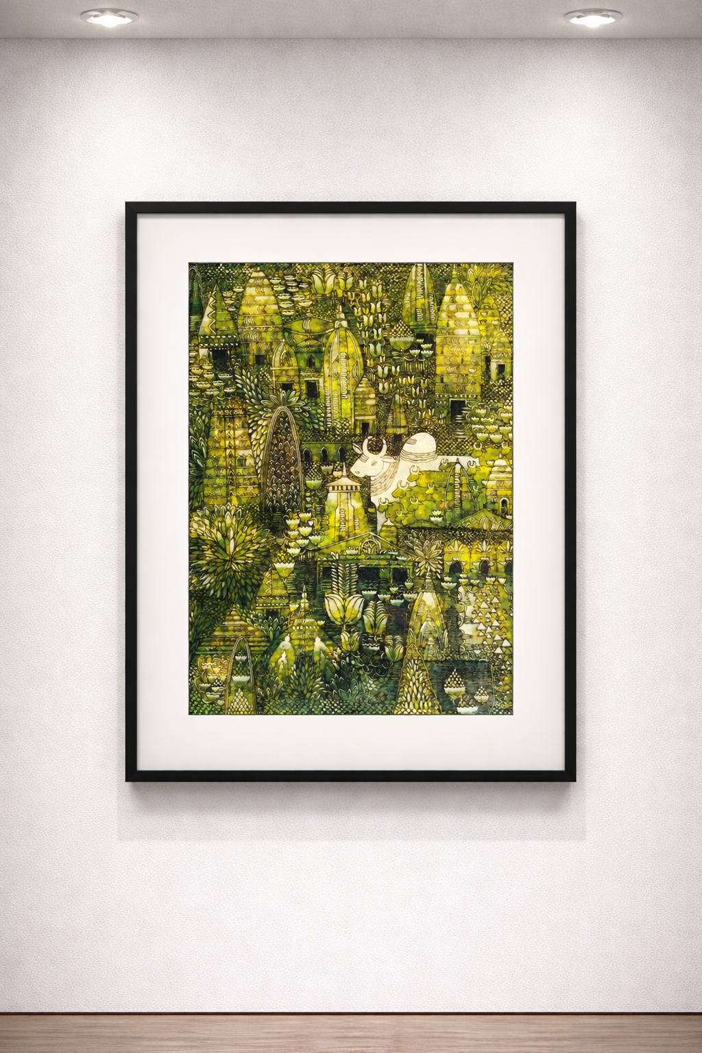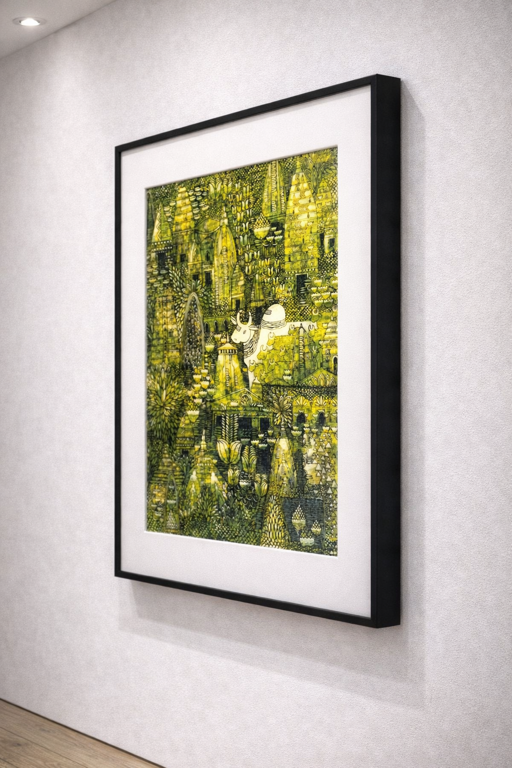 Rendered in earthy green and ochre tones, this 24 x 18 inch canvas features mystical figures, layered temple motifs, and flowing pathways, inviting viewers into a space of peace and timeless devotion. Anjiya Naik’s use of delicate linework, texture layering, and symbolic storytelling transforms the canvas into a modern shrine — a place where inner and outer sanctuaries meet.